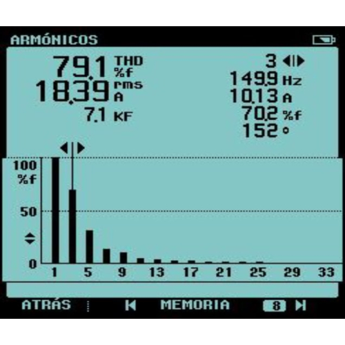 Mediciones: • Corriente / Tensión / Potencias (Activa-Reactiva-Aparente) / Factor de Potencia / Frecuencia / Energía / Flickers / Calidad / Ruido eléctrico / Transitorios de Arranque. • Lectura de Demanda: Corriente / Promedio de Factor de Potencia / Potencia (Activa-Reactiva-Aparente). • Análisis de armónicas. • Análisis hasta 63. Armónica (por fase y total). • Distorsión armónica en tensión y en corriente (por fase y total).
